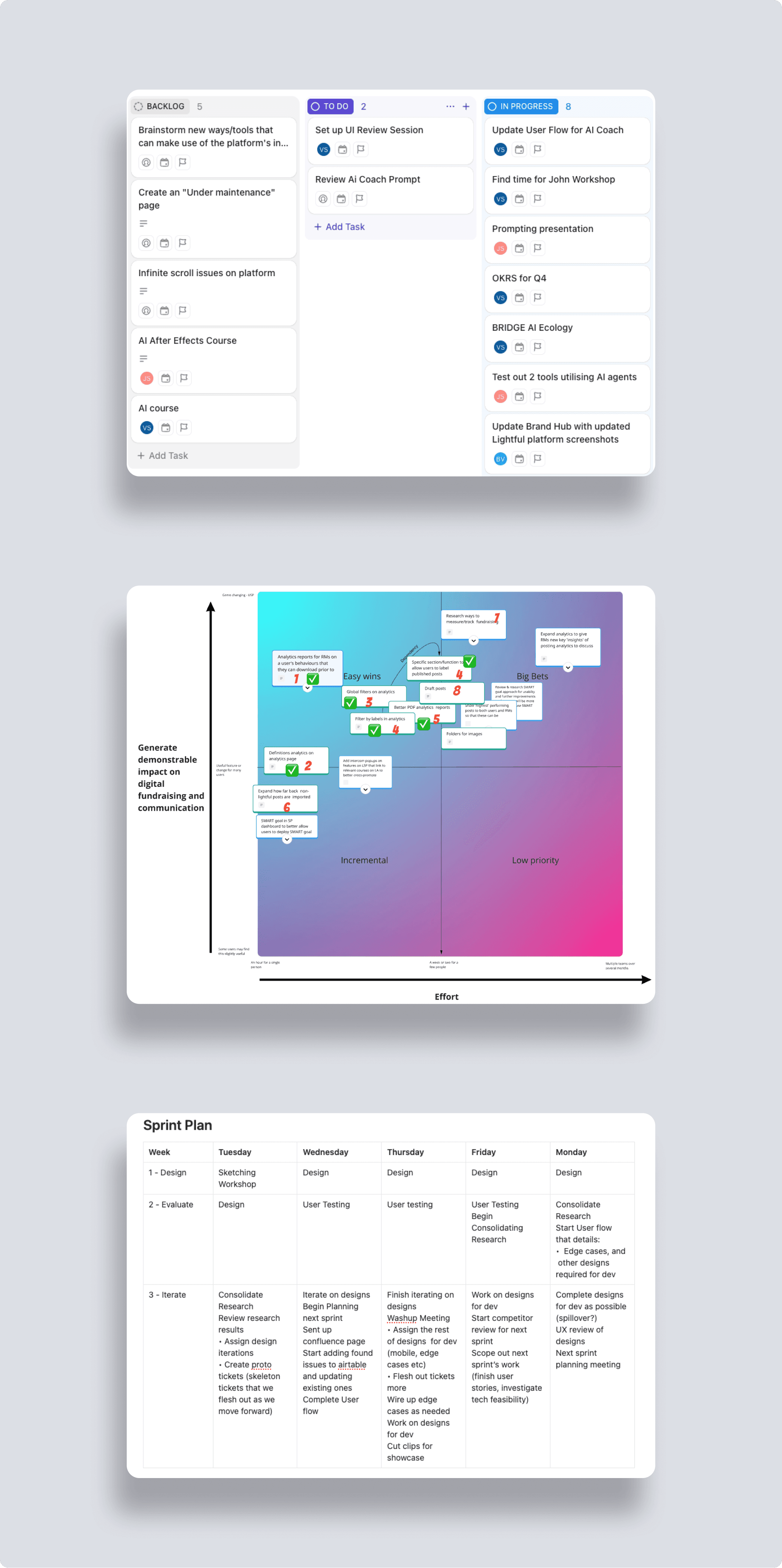 Alignment: Working with designers can be a challenge - we like to explore, but other departments just want things done. I worked with product to create a ticketing system in Jira (and later Clickup) to allow other teams to assign us tasks. I created a shared a "working with us" document I developed with my team. This outlined ideas like "Give us Challenges" Stakeholder Management: One of my key wins was aligning the C-Suite and the design/dev team. I facilitated Prioritization Workshops using modified RICE frameworks (Miro Friendly), ensuring our design efforts were focused on features that provided the highest ROI for our non-profit users. Architecting the Workflow: I implemented a "Dual-Track Agile" approach. While the engineering team was building current sprints, I led the design team in "Discovery Sprints." This ensured that by the time a feature (like the SMART Goal Tester) reached development, it had been de-risked through high-fidelity prototyping and usability testing.