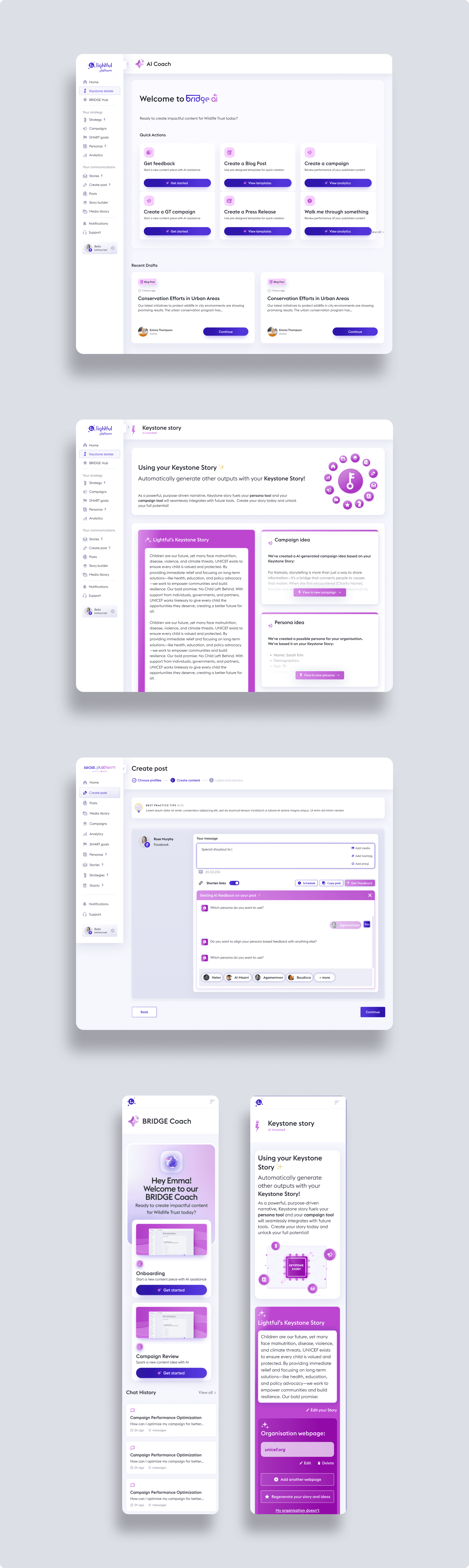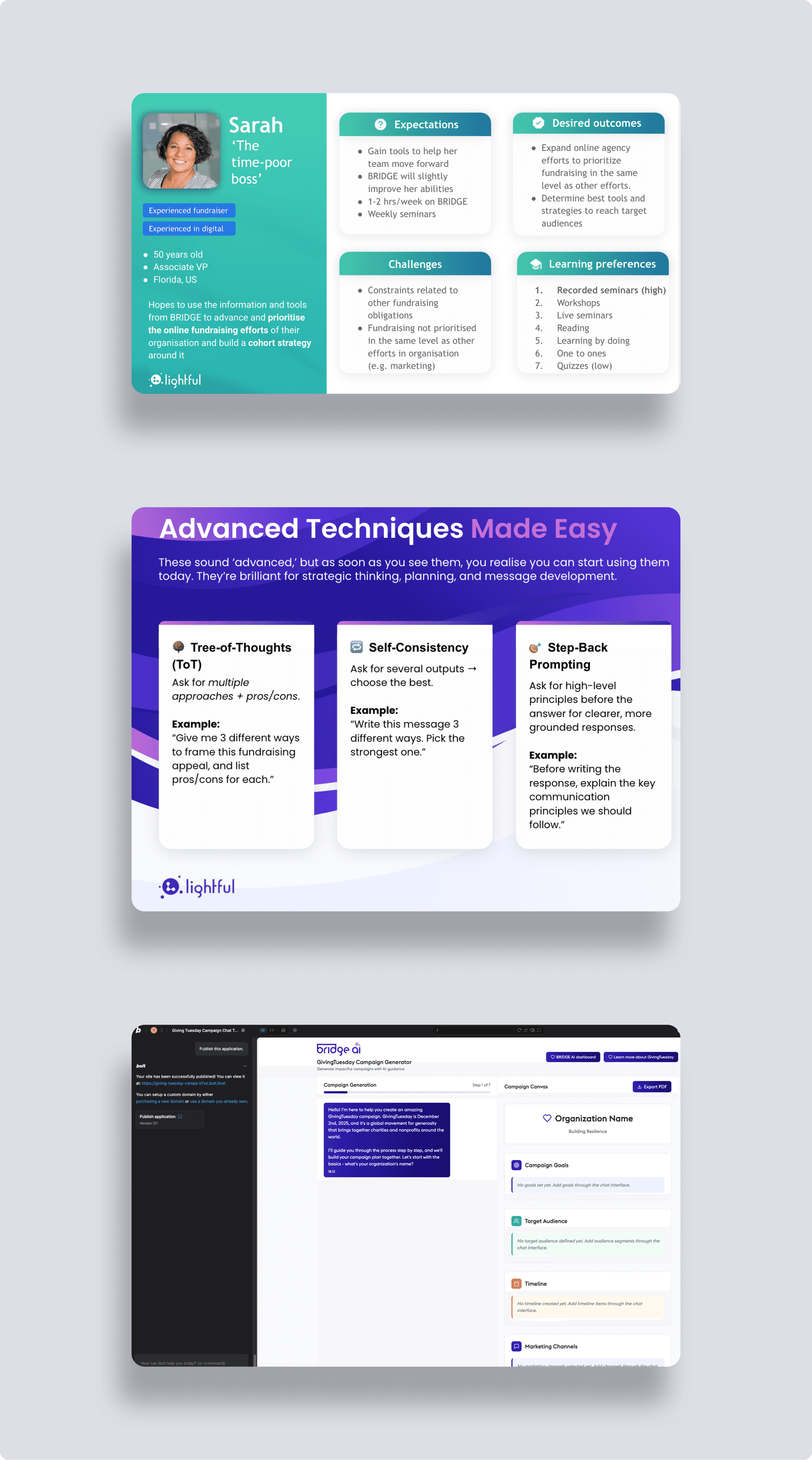 Lightful is a tech-for-good company aimed at providing impactful fundraising and marketing tools for a variety of non-government, government and business users around the world. It was now looking at adding AI tools to its suite of tools. In my role as Head of Design at Lightful, I led a Design Team of 4 (5 including me) to articulate the product vision and design the core experience for AI tools to enhance their offering. Over the course of 3 years I led the team, and provided UX Leadership for, for this AI offering, known as "BRIDGE AI".